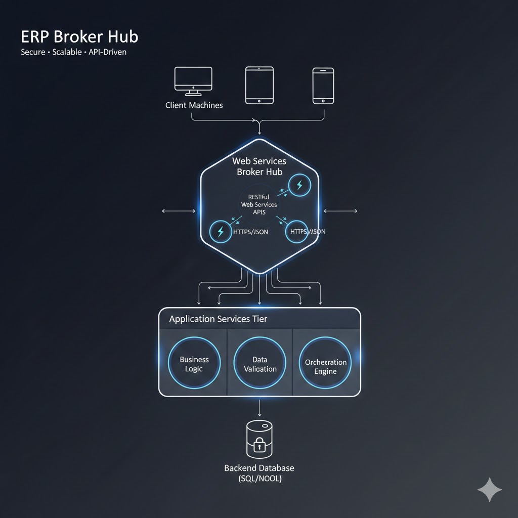Our ERP Broker Hub is a high-performance, 3-tier middleware architecture designed to act as the “universal translator” for your enterprise ecosystem. It eliminates point-to-point code and replaces it with a streamlined, secure, and scalable API-driven highway interchange.